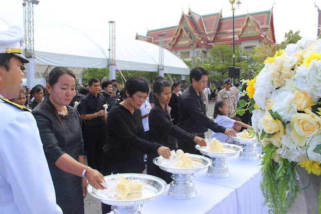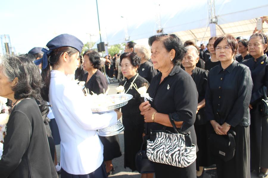 อาสาสมัครป้องกันภัยฝ่ายพลเรือน พร้อมจิตอาสา ทหาร ตำรวจ สห. ก็เหน็ดเหนื่อยไม่แพ้ใคร จัดระเบียบการเข้าวางดอกไม้จันทน์ หน้าพระเมรุมาศจำลอง เนื่องจากจำนวนพสกนิการ ที่มากมายมหาศาล จึงทำให้การจัดที่นั่ง ที่เตรียมไว้ค่อนข้างลำบาก เพราะที่ไม่พอ ต้องเข้าแถวรอ ยืนรอ นอกเต้นท์กันแดด อากาศที่ร้อน จึงทำให้หลายคนต้องหาอะไรมาบัง ออกจากแถวก็ไม่ได้ โชคดีที่มีจิตอาสา มาคอยบริการเครื่องดื่ม อาหาร ให้จนถึงแถวคอย คุณยายท่านหนึ่ง เล่าว่า มาตั้งแต่ สามโมงเช้า จนถึงเย็นยังไม่ได้เข้าวางดอกไม้จันทน์ แต่ก็ยังมีสีหน้า แววตา ที่ สู้สู้ ...